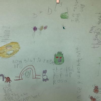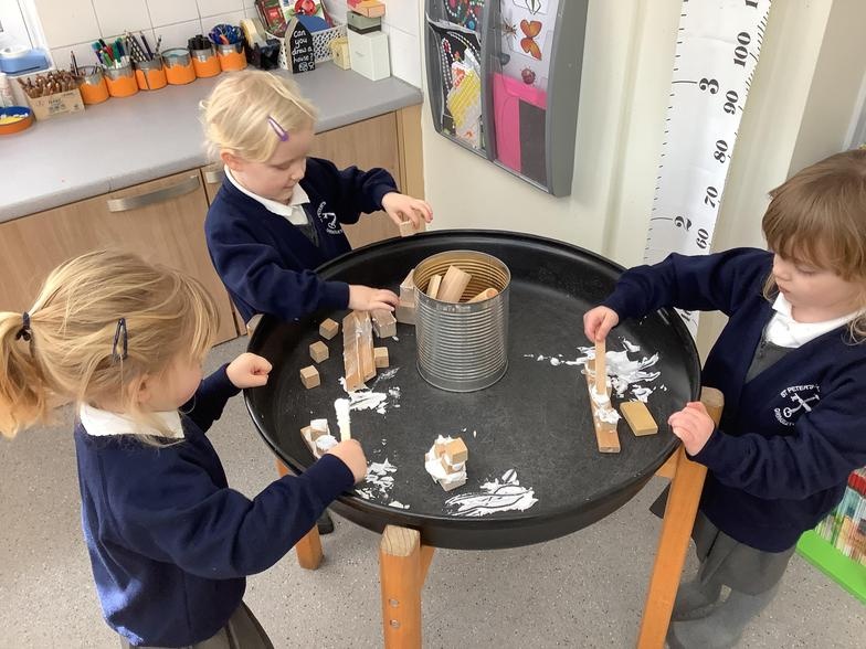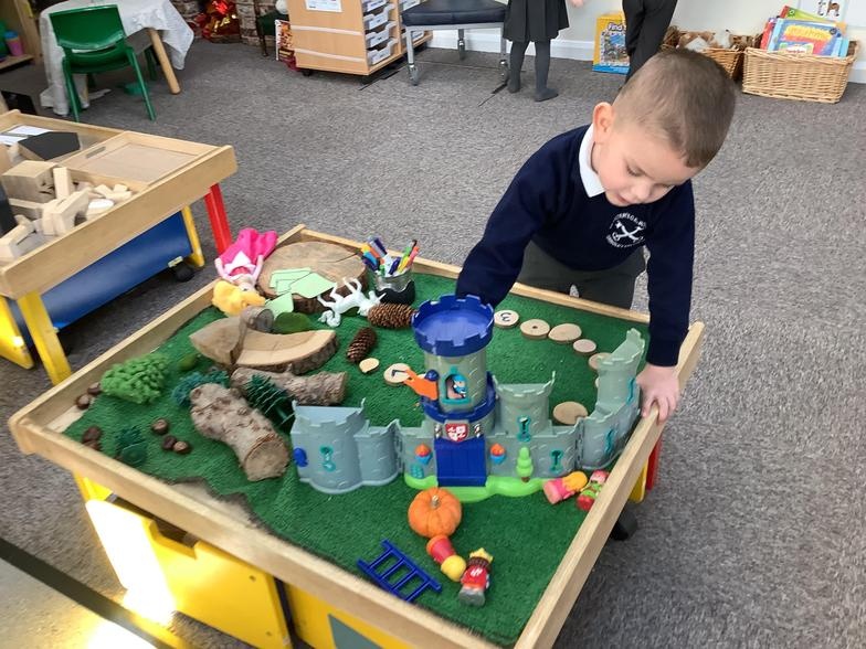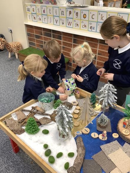 So far, we have made porridge, drawn a story map, built castles and made fairy wands, baked gingerbread and designed bridges. By immersing ourselves in activities and play, we use lots of storytelling language and this enables us to write labels for our buildings, speech bubbles for our characters and have the ideas and confidence to use mark making in all of our play.