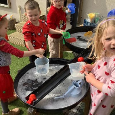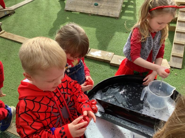 The children enjoyed wearing their red clothes to school and we even found some old red noses to use for water fun!