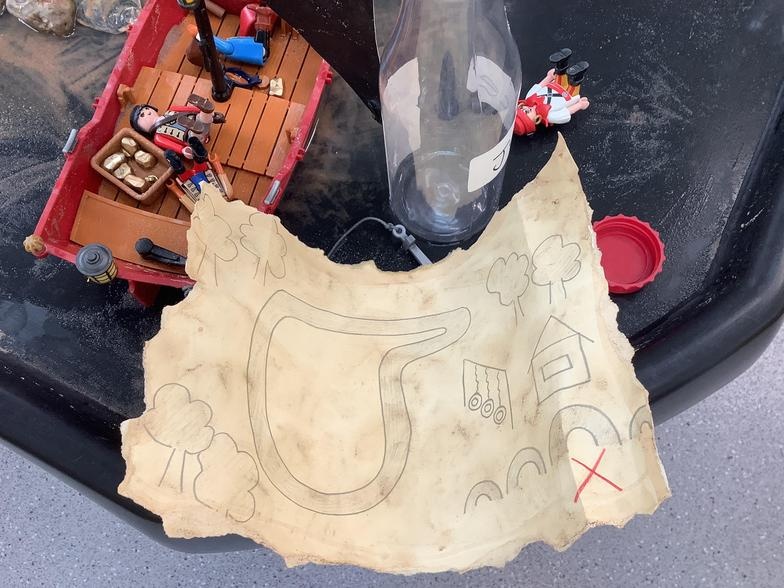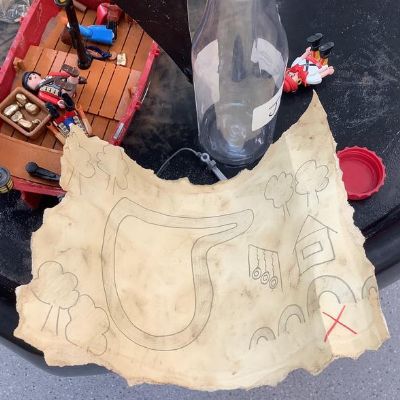 Then, we found a message in a bottle! It was a treasure map from Pirate Pete. We followed the map and found the treasure - it was our snack! So we sat outside and enjoyed a mid-morning picnic.