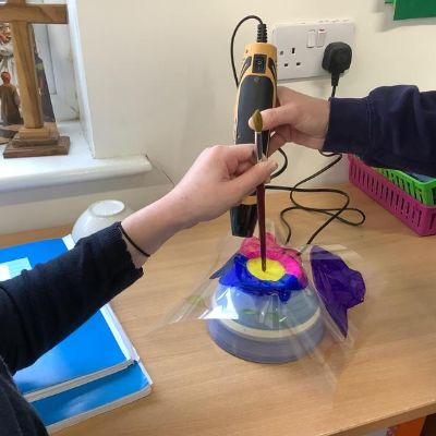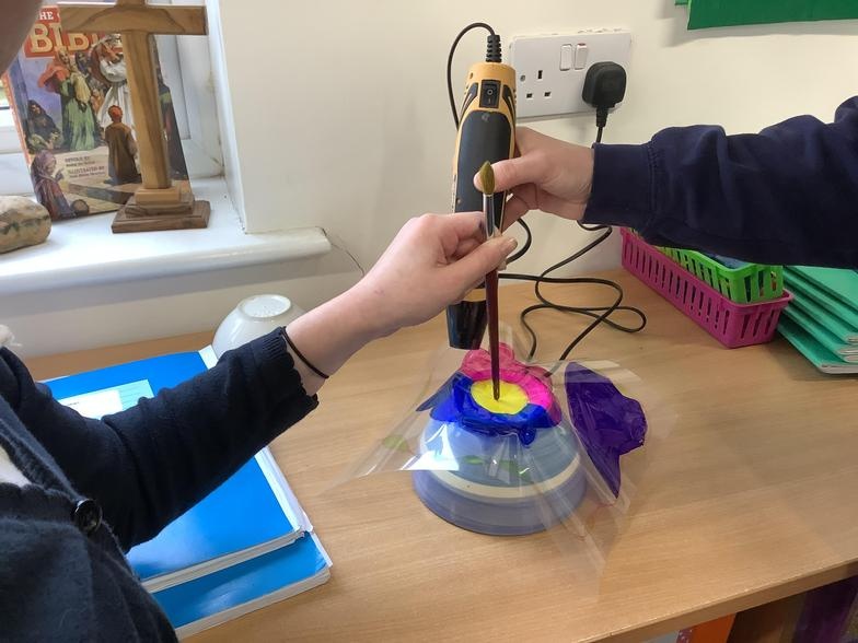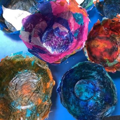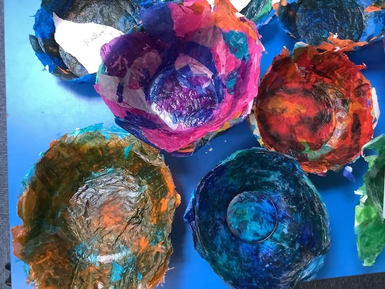 Dale Chihuly is an American glass sculpture. The children have created 3d pieces of art inspired by Dale Chihuly’s glass work. They used papier-mâché with tissue paper and pva glue. A selection of bowls were used for armatures. They used coffee filters and water based markers and acetate sheets moulded using a hot air gun. The results were fabulous.