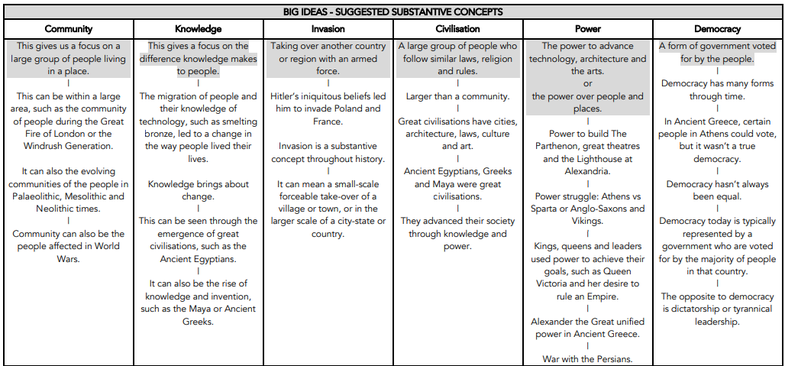 CUSP have defined substantive concepts that are the suggested vehicle to connect the substantive knowledge. These are defined at the start of every study in the Big Idea.