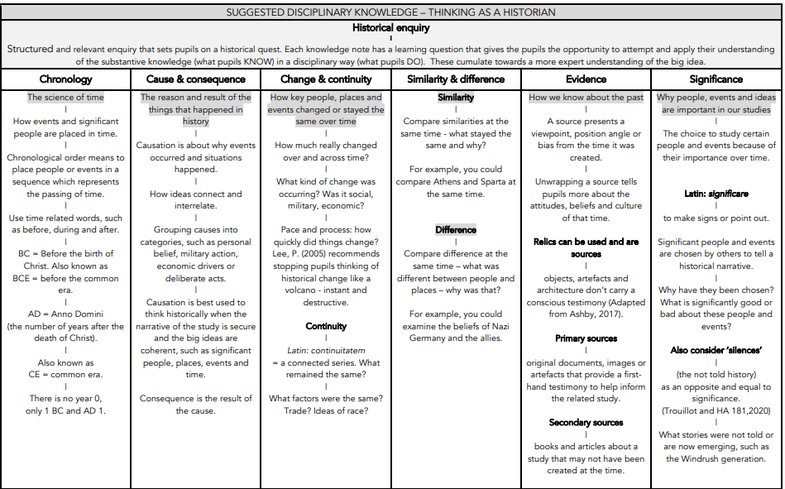 b. Disciplinary knowledge – this is the use of that knowledge and how children construct understanding through historical claims, arguments and accounts. CUSP call it ‘Working Historically.’ The features of thinking historically may involve significance, evidence, continuity and change, cause and consequence, historical perspective and contextual interpretation. Content infused and adapted from HA – Teaching History 179 and 180, 2020.