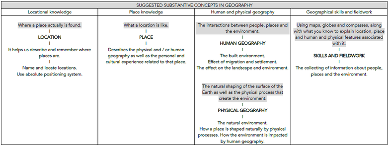 d) Substantive concepts are the big ideas, and the golden threads, that run through a coherent and cohesive geography curriculum. They can include place, space, scale, interdependence, physical and human processes, environmental impact, sustainable development, cultural awareness and cultural diversity. Concepts such as change through erosion are taught through explicit vocabulary instruction as well as through the direct content and context of the study