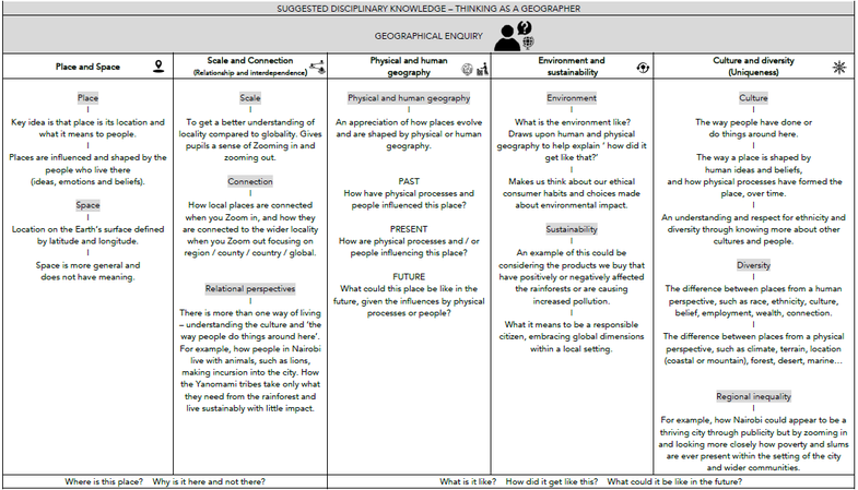b) Disciplinary knowledge – this is the use of knowledge and how children become a little more expert as a geographer by Thinking Geographically. CUSP draw upon the work of Cresswell, Lambert and Massey to offer suggestions about the discipline of geography.